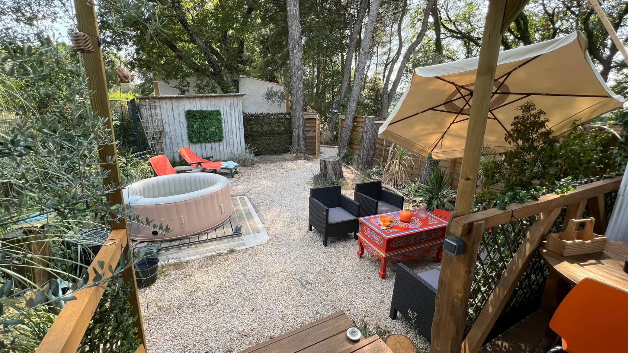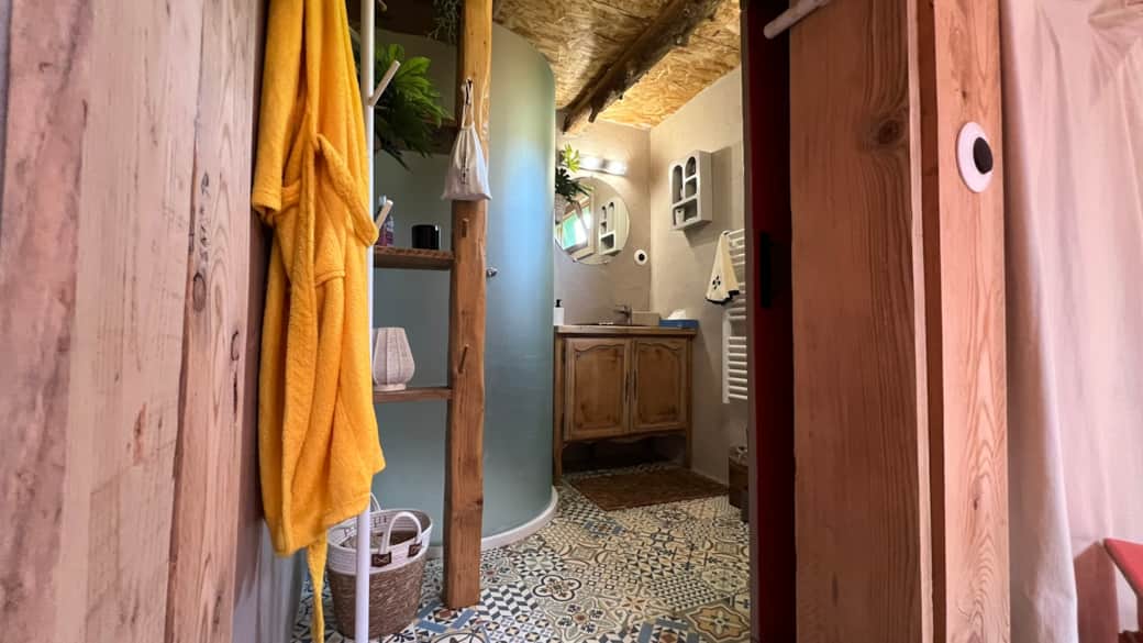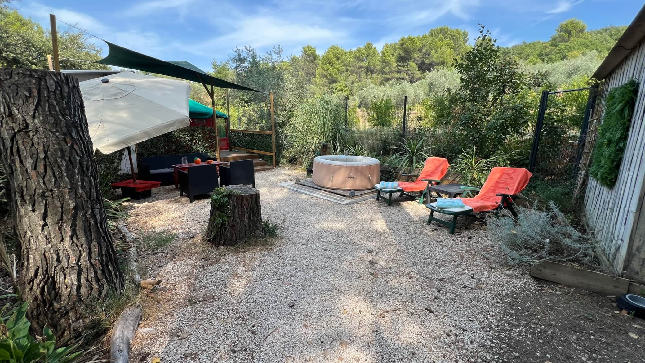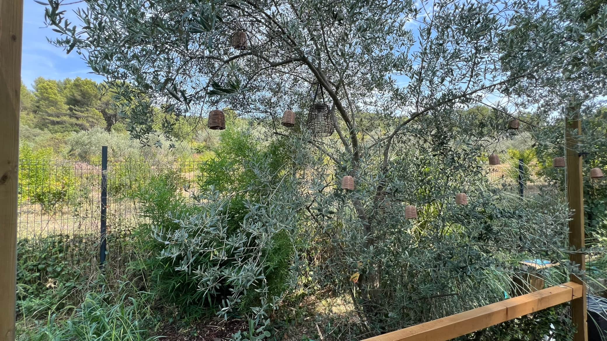 Placée dans notre forêt de 3000m2 et près de vergers de grenade et champs d’oliviers (agriculture biologique).